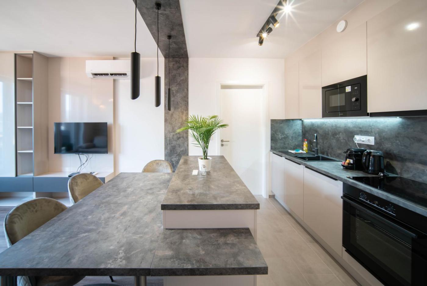 Two-Bedroom Apartment. Guests can make meals in the kitchen that features a stovetop, a refrigerator, a dishwasher and kitchenware. This apartment is air-conditioned and has a seating area with a flat-screen TV, a washing machine, a private entrance, soundproof walls, as well as a tea and coffee maker. The unit has 3 beds.